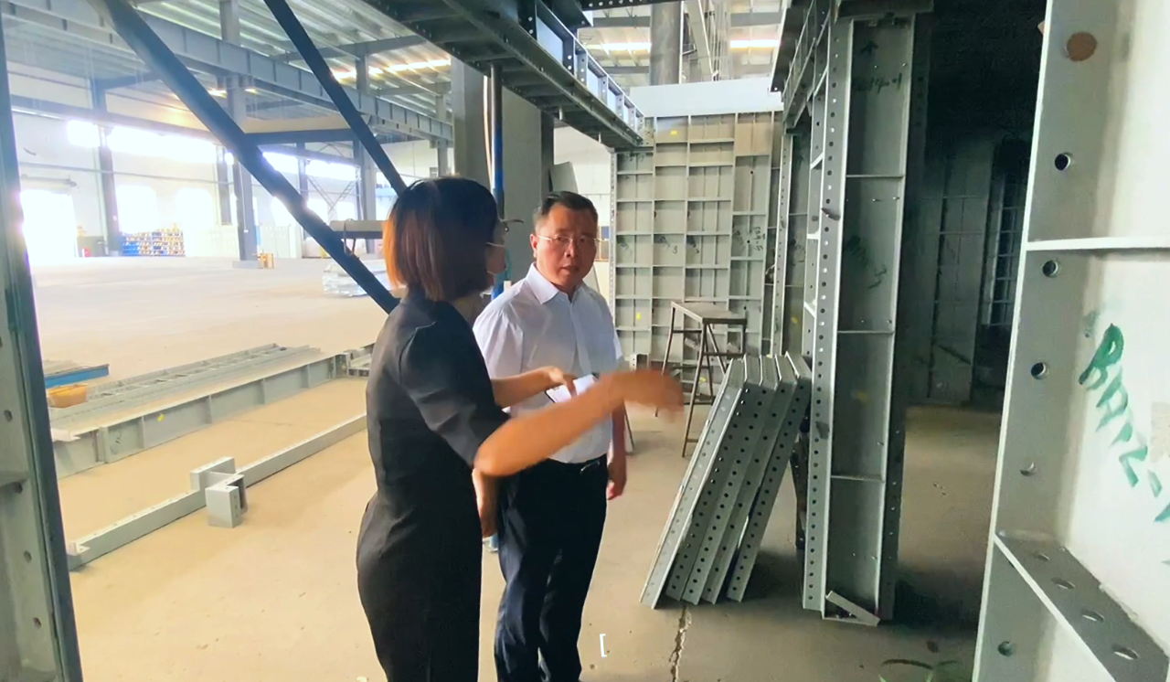 在桃江基地,領導一行深入鑫政鋁模板生產及預拼裝等車間,了解裝配式鋁模板在生產、使用、回收等環節替代傳統模板的優勢及意義,詢問桃江基地當前的產能產值、經營現狀,并重點就國家、省、市惠企助企相關政策在企業的落實情況,以及企業在生產經營過程中面臨的困難與問題進行了細致調研。