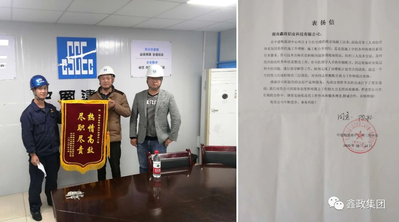 瀏覽次數:1572近日,中建五局第三建設有限公司中建梅溪湖中心項目部和現場勞務公司長沙博大建筑勞務有限公司送來錦旗和表揚信,對鑫政鋁業(yè)技術服務科楊共忠在項目上的出色表現給予了充分肯定和高度評價。_20250530091630A310.jpg)